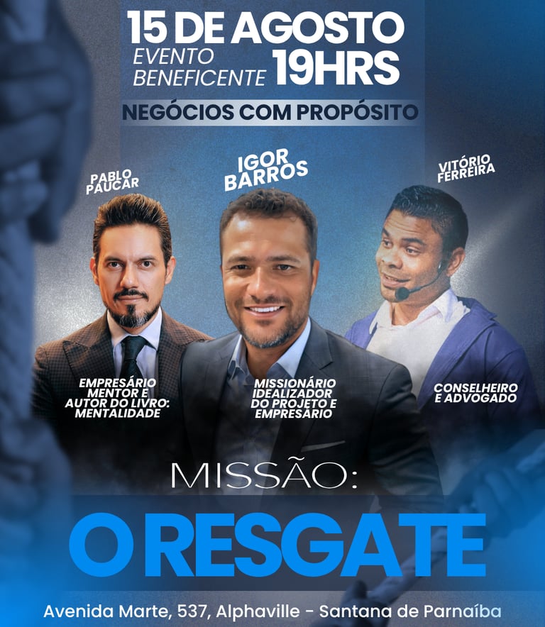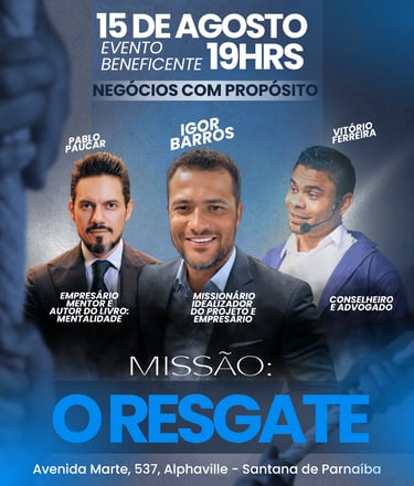 Contribuindo com apenas R$ 150,00, você Participa do banquete de mentalidade com grandes empresários e palestrantes, pode levar até 2 pessoas com você e ainda ajuda a resgatar pessoas em situação de rua. O evento ocorerá no dia 15 de agosto de 2025 Em Alphaville/Santana de Parnaíba.